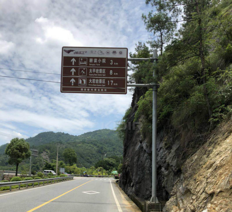 旅游標(biāo)志牌一般由標(biāo)志底板、標(biāo)志面、立柱、緊固件、基礎(chǔ)等幾部分組成??煞譃橹敢龢?biāo)志和旅游符號(hào)標(biāo)志兩大類。顏色為棕底、白字(圖形)、白邊框、棕色襯邊。